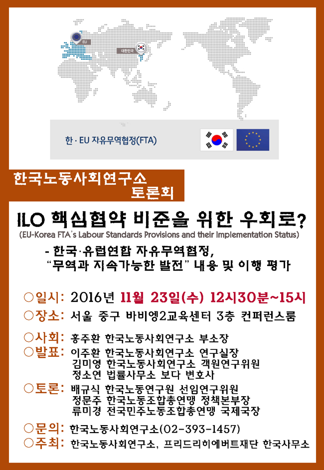 ○주제: ILO 핵심협약 비준을 위한 우회로? - 한국·유럽연합 자유무역협정, “무역과 지속가능한 발전” 내용 및 이행 평가