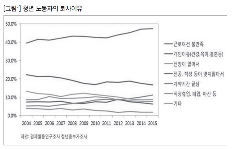 [그림1]을 보면, 청년들의 퇴사 이유 중에서 유일하게 수치가 올라간 항목이 ‘근로여건 불만족’과 ‘계약기간 끝남’이다. 이 중에서도 ‘근로여건 불만족’의 비율이 가장 높게 나타난다. 2004년 39.4%에서 2015년에는 47.7%로 8.3% 포인트나 올라갔다. 계약기간이 끝났기 때문이라는 이유도 2004년에는 5.3%에 불과했는데 2015년에는 11.2%로 올랐다. 청년 일자리가 좋은 일자리라기보다는 나쁜 일자리라는 설명이 설득력을 얻는다. 하지만 이런 결과를 놓고 혹자는 청년 구직자에게 눈높이를 낮추라고 말하기도 한다. 이 말처럼 눈높이를 낮추면 고용률은 올라갈까. 그럴 수만 있다면 좋겠지만, 현실은 청년 노동자에게 잔인하다.