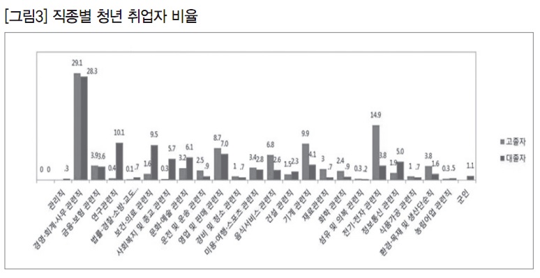 청년 노동자들이 어떤 산업과 직종에서 일하는지 살펴보면, 산업별로 고졸자는 제조업 취업률이 42.3%로 가장 높았고, 도매 및 소매업이 12%를 차지한다. 대졸자도 제조업 취업률이 가장 높았으나 18.1%로 고졸자보다 낮았고, 대신 교육서비스업과 보건 및 사회복지업의 비중이 14.2%로 높게 나타났다. 직종별로 보면, 고졸자와 대졸자 모두 경영·회계 등 사무직 비중이 가장 높았다. 다른 직종의 경우 고졸자는 전기·전자 직종의 취업률이 14.9%, 기계 관련직이 9.9%로 높았다. 대졸자의 경우는 연구 관련직의 취업률이 10.1%, 보건·의료 관련직 취업률이 9.5%로 높은 비율을 보였다.
