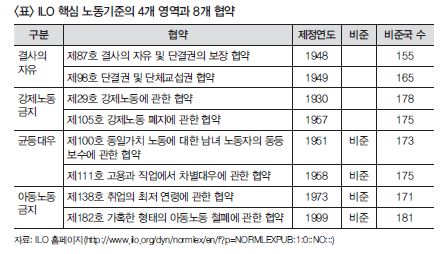 한국의 경제 수준에 걸맞은 국제노동규범은?
