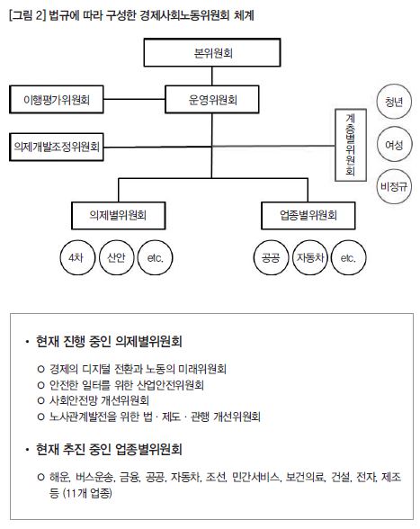 이를 위해 본위원회 위원을 기존의 정상단체 대표로 노·사 각 2인으로 두었던 것을 노측은 청년, 여성, 비정규직 대표를, 사측은 중견기업, 중소기업, 소상공인 대표를 포함하여 노사 각 5명으로 확대했다. 더욱이 본위원회에서 미조직 취약계층 대표가 자신이 속한 계층의 목소리를 조직적으로 취합하기 위해 특별위원회 형태로 ‘사회 각 계층 관련 위원회’를 두기로 했다. 계층별위원회는 해당 계층을 대표할 수 있는 전국적인 단체들로 구성하고 관련 전문가들로 자문단을 두어 의제 형성을 지원하게 된다.