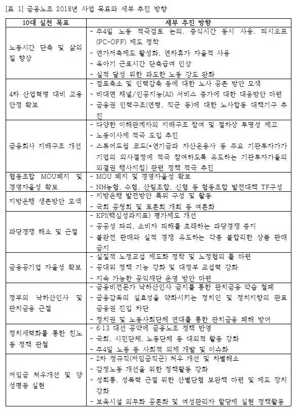 금융노조는 지난 2018년 1월 24일 정기대의원대회에서 금융 공공성 강화와 관치금융 철폐, 양극화 해소, 과당경쟁 근절, 생존권 사수를 핵심으로 10개 실천사항을 의결했다. 10개 실천사항은 △노동시간 단축 및 삶의 질 향상 △4차 산업혁명 대비 고용안정 확보 △금융회사 지배구조 개선(경영참가, 임원선임절차 투명성 강화) △협동조합 MOU 폐지 및 경영 자율성 확보 △지방은행 생존방안 모색(특위 구성)  △핵심성과지표(KPI) 제도 개선 및 공공성 파괴, 소비자 피해 초래하는 과당경쟁 근절 △금융공기업의 경영자율성 확보 및 실질적 노정교섭 제도화 △정부의 낙하산 인사 및 관치금융 근절 △정치세력화를 통한 친노동 정책 관철(6·13 지방선거) △저임금직군 처우개선 및 양성평등 실현 등이 포함된다. 이러한 사업 목표를 달성하기 위한 추진방향은 다음의 [표 1]과 같다.