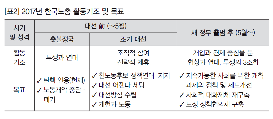 2017년을 시기별로 분류하면 첫째, 3월 초‧중순까지는 촛불정국 하에서 헌재 탄핵 결정까지의 시기가 될 것으로 보인다. 이에 한국노총은 국민 촛불항쟁의 목표인 헌재 탄핵인용, 노동개악 중단‧폐기를 관철시키기 위하여 2016년부터 이어 온 ‘투쟁과 연대’의 기조를 유지한다.