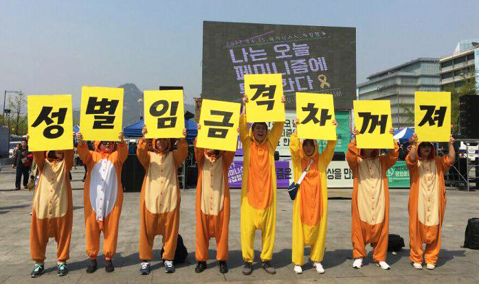 (2017년 4월15일 광화문에서 열린 ‘2017 페미니스트 직접행동’에 참여한 참석자들이 성별 임금격차를 반대하는 퍼포먼스를 벌이고 있다. ⓒ여성노조)