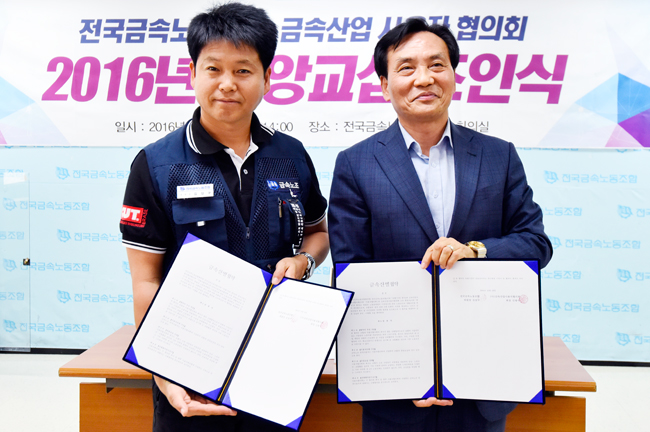 (김상구 금속노조 위원장과 신쌍식 금속산업사용자협의회장이 10월18일 2016년 중앙교섭 조인식을 마치고, 기념촬영을 하고 있다. ⓒ금속노동자 신동준)