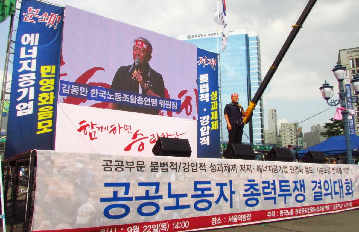 (김동만 한국노총 위원장이 9월22일 서울역광장에서 열린 공공노련의 '공공노동자 총력투쟁 결의대회'에서 발언하고 있다 ⓒ한국노동사회연구소)