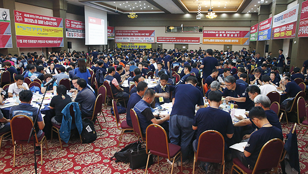 조직혁신전략 세부 내용 중 마지막 안건인 정치전략 논의는 예상대로 뜨거운 감자였다. 22일을 기준으로 민주노총 대의원은 963명이다. 정책대대가 시작할 즈음 512명이던 참가 대의원은 정치전략이 논의될 즈음 581명으로 늘어났다. 여기에 참관인 규모만 200여 명에 달했다. 600석이 준비된 회의장이 발 디딜 틈 없이 북적였다.