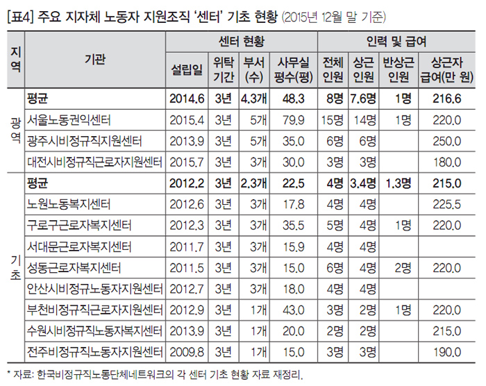 지자체에서 직영 혹은 위탁 형태로 운영하는 노동자 지원센터는 약 16개이며, 광역보다는 기초지역의 센터들이 상대적으로 일찍 만들어졌다. 광역지자체 센터의 설립 시기는 2014년부터이고, 기초지자체 센터의 설립 시기는 2012년부터다. 지자체의 위탁 센터는 조례에 근거하여 평균 3년 동안 위탁‧운영되며, 평가 등을 통해 위탁 혹은 재위탁 과정을 거친다. 센터 내 부서는 광역지자체(4.3개)가 기초지자체(2.3개)보다 많고, 인원 또한 광역지자체(8명)가 기초지자체(3.4명)에 비해 2.5배 이상 많다([표4]).