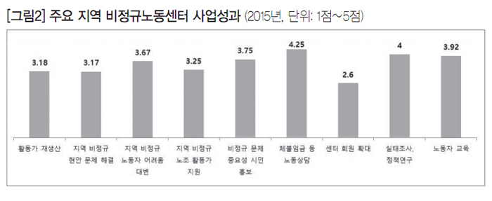 또한 주요 사업성과는 △체불임금 등 노동상담(4.25점), △실태조사, 정책연구(4점), △노동자 교육(3.92점), △시민 대상 비정규 문제의 중요성 홍보(3.75점), △지역 비정규 노동자의 어려움 대변(3.67점), △활동가 재생산(3.18점), △지역 비정규 현안 문제 해결(3.17점), △센터 회원확대(2.6점) 순이었다([그림2]).지자체 위탁 센터들은 민간위탁이라는 한계(정책영역, 수단, 자원)에도 불구하고 짧은 시기에 많은 성과를 거두었다. 대표적으로 지역 내 비정규직 실태조사를 통해 노동정책의 밑바탕이 되는 자료들을 축적했고, 해당 내용이 지자체 사업에 반영된 곳들도 있다. 물론 성과만 있는 것은 아니다. 2015년 주요 센터 담당자를 대상으로 설문조사한 결과, 센터 운영의 주요 애로사항으로 △지자체와 갈등(3.56점), △정책 역량 한계(3.33점), △지역 무관심(2.89점), △재정 한계(2.78점), △회원 확대 한계(2.44점), △불협화음(1.78점), △내부 갈등(1.57점) 등이 꼽혔다.