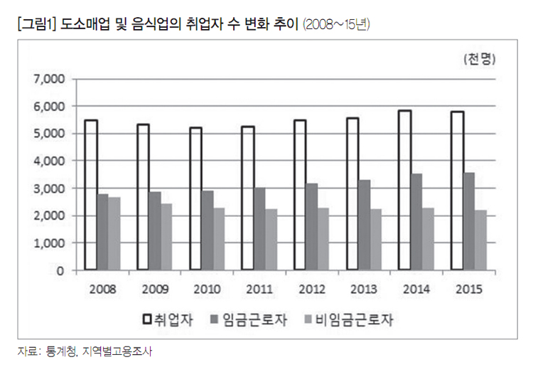 영세자영업이 집중되어 있는 도소매업과 음식업의 경우 자영업자가 줄어들고 임금근로자가 늘어나는 방향으로 내부 구조조정이 진행되고 있다. [그림1]은 2008년부터 2015년까지 도소매업과 음식업 취업자 수의 변화를 임금근로자와 비임금근로자로 나누어서 살펴본 것이다. 이 기간 동안 임금근로자는 277만 6천 명에서 355만 6천 명으로 꾸준히 늘어난 반면, 비임금근로자는 268만 6천 명에서 222만 3천 명으로 46만 3천 명 줄어들었다. 비임금근로자의 감소 추세는 해당 기간 동안 2012년에 잠시 늘어난 것을 제외하면 계속 이어지고 있다.