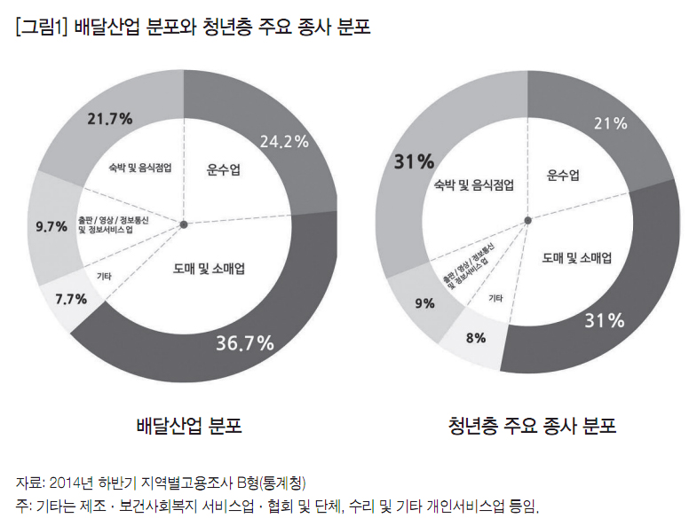 우리나라 배달산업은 통계청 산업분류상 ‘늘찬 배달업’으로 구분된다. 사업체 수(2013년 전국사업체조사)는 약 1,218개(종사자 수 8,265명)인데 대부분 단독사업체(1,201개, 종사자 수 7,803명)이다. 사업체 규모는 10인 미만이 80.2%(5인 미만 58.4%)이며, 종사자 규모는 10인 미만이 40.3%(5인 미만 17.3%)이다. 배달 종사자의 인구학적 속성(2014년 고용노동부 지역별고용조사)은 15~34세 미만의 청년층(21.4%)보다는 비청년층(78.6%)이 더 많다. 배달 종사자의 지위는 비정규직 31.8%(청년 47.7%), 자영업·특수고용 종사자 34%(청년 13.8%), 정규직 29%(청년 31.3%), 무급가족 종사자 5.3%(청년 7.2%) 순이다.