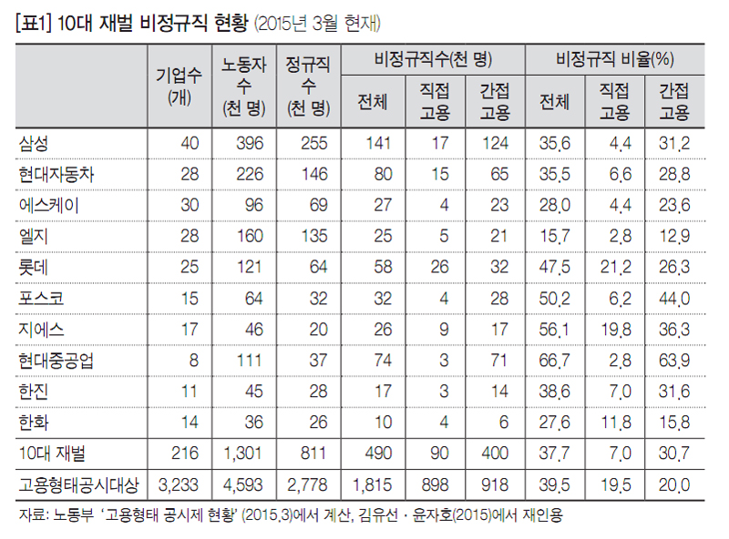 노동부 고용형태 공시제 결과에 따르면 2015년 3월 300인 이상 대기업에서 일하는 노동자 459만 명 중 비정규직은 182만 명(39.5%)이고, 직접고용 비정규직은 90만 명(19.5%), 간접고용 비정규직은 92만 명(20.0%)이다. 10대 재벌기업 노동자 130만 명 중 비정규직은 49만 명(37.7%)이고, 기간제 등 직접고용 비정규직은 9만 명(7.0%), 사내하청 등 간접고용 비정규직은 40만 명(30.7%)이다. 10대 재벌 사내하청은 대부분 상시·지속적 일자리이자 불법파견이다. 현행법만 엄격하게 적용하더라도 10대 재벌 사내하청을 정규직 직접고용으로 전환하고, 좋은 일자리 40만 개를 만들 수 있다([표1] 참조).
