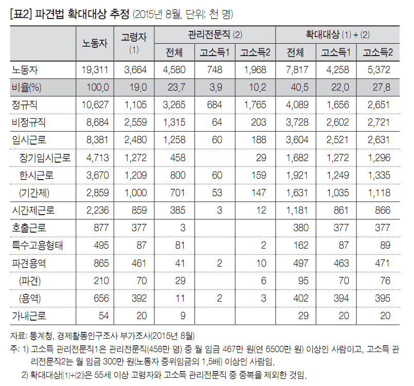 둘째, 정부안은 55세 이상 고령자 366만 명(전체 노동자의 19.0%)과, 고소득 관리전문직 75만 명(3.9%) 내지 197만 명(10.2%)에게 파견근로를 전면 허용하겠다는 것이다. 55세 이상 고령자와 고소득 관리전문직은 중복을 제외해도 426만 명(22.0%) 내지 537만 명(27.8%)이다. 전체 노동자 4명 중 1명꼴로 새로이 파견근로 대상에 추가하겠다는 것이다([표2] 참조).