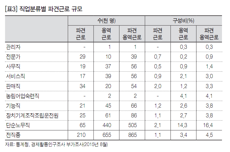 경제활동인구조사 부가조사에서 파견근로와 용역근로를 구분한 것은 1998년 파견법을 도입하기 전에도 허용되던 청소·경비 등을 새로이 허용되는 파견근로와 구분하기 위해서였다. 현행 파견법 시행령은 단순노무직에서 청소, 경비, 주차장관리원, 배달·운전·검침종사자를 근로자파견대상업무로 허용하고 있다. 2015년 8월 단순노무직은 파견근로 6만5천 명, 용역근로 44만 명으로 집계되는데, 실제로는 이들 모두가 파견근로자로 파견근로와 용역근로를 구분할 이유가 없다([표3] 참조).