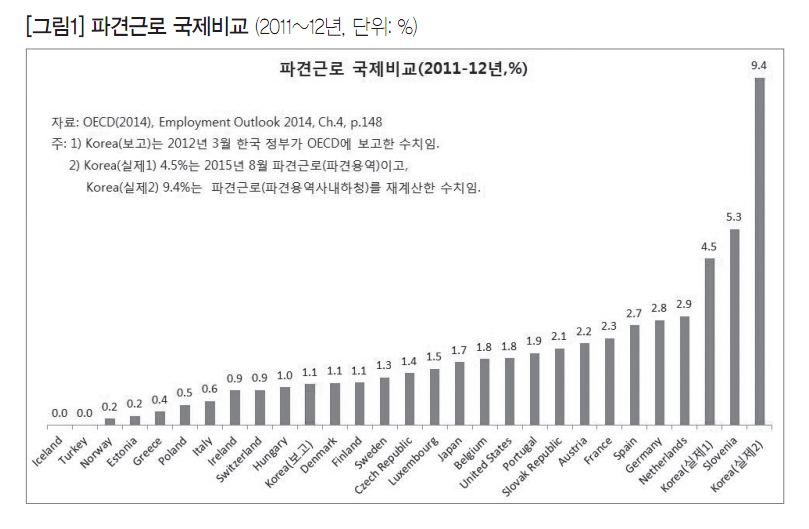 2015년 8월 파견근로와 용역근로를 합친 파견(용역)근로는 87만 명(4.5%)이다. 고용형태 공시제 결과(2015년 3월)에서 300인 이상 대기업 사내하청은 92만 명(4.9%)이다. 따라서 실제 파견근로(파견, 용역, 사내하청)는 179만 명(9.4%)을 넘어설 것으로 보인다. 노동부가 OECD에 보고한 파견근로 비율은 2012년 3월 1.1%로 국제적으로 낮은 편에 속한다. 그러나 용역근로를 합치면 4.5%로 슬로베니아(5.3%) 다음으로 높고, 사내하청까지 합치면 9.4%로 OECD 국가 중 가장 높다. 한국은 비정규직 규모가 많고 차별이 심한 것 이외에도, 고용이 매우 불안정한 간접고용 또는 파견근로 비중이 높은 나라다([그림1] 참조).