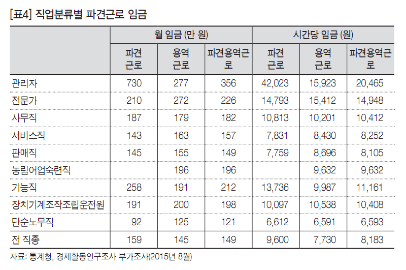 [표4]에서 월 평균임금은 파견근로(159만 원)가 용역근로(145만 원)보다 높다. 따라서 파견근로가 용역근로보다 고용조건이 좋다고 오해하기 쉽다. 직업별로 살펴보면 단순노무직은 용역근로(125만 원)가 파견근로(92만 원)보다 높다. 전문가와 서비스직, 판매직, 장치기계조작조립운전원도 마찬가지다. 고령자가 많이 일하는 청소·경비 등 단순노무직의 시간당 임금은 파견근로(6,612원)와 용역근로(6,591원)가 사실상 동일하다.