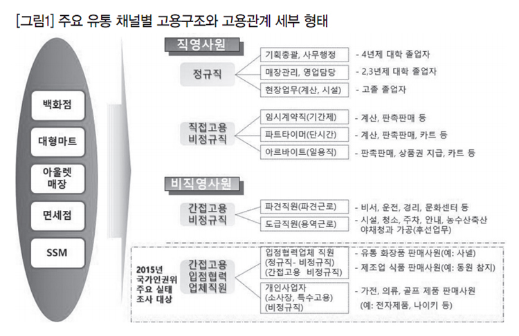 국내 유통업체의 고용구조는 직영사원(원청업체 정규직, 직접고용 비정규직)과 비직영사원(간접고용 비정규직, 입점협력업체 직원, 개인사업자 형태 전문판매 직원 등, 비율 약 75∼85%)으로 구분할 수 있다. 그런데 백화점, 면세점, 할인점 등 주요 유통업의 고용형태는 대부분 비정규직과 입점협력업체(수수료, 임대매장) 종사자로 이들의 수는 정규직보다 훨씬 많다.