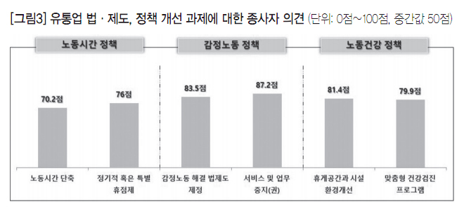 특히 유통업 서비스 판매직은 업무의 특성상 감정노동을 수행하는 경우가 많은데, 법·제도 개선 과제에 대해 설문조사한 결과, 유통업 종사자들은 감정노동 법제화(83.5점)와 작업중지권(87.2점)에 대한 요구가 높은 것으로 나타났다([그림3] 참고). 따라서 정부 차원의 종합적인 유통업 감정노동자 건강 문제 해결방안이 모색되어야 한다.