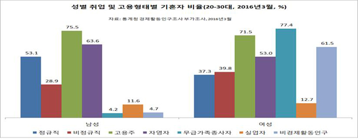 2016년 3월 통계청 경제활동인구조사부가조사에서 20, 30대 기혼자 비율을 살펴보면, ‘남성은 학력수준이 높을수록, 취업하고 고용형태가 안정적일수록, 임금수준이 높을수록 기혼자 비율이 높다.’ 고용주는 기혼자 비율이 75.5%인데 정규직은 53.1%, 비정규직은 28.9%, 실업자는 11.6%다. 임금수준이 가장 낮은 1분위(하위 10%)는 기혼자 비율이 6.9%로 가장 낮은데, 임금수준이 가장 높은 10분위(상위 10%)는 82.5%로 가장 높다. 대졸자는 기혼자가 47.9%인데 중졸자는 35.4%다.