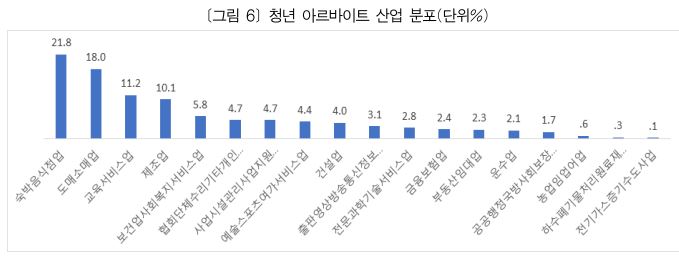 청소년 아르바이트 노동자 대부분이 숙박·음식점업(21.8%), 도·소매업(18.8%), 교육서비스업(11.28%), 제조업(10.18%), 보건업·사회복지서비스업(5.88%)에 종사하고 있다.
