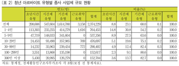 [표 2]에서와 같이 초단시간 유형과 시간제 유형 사용 비율은 사업장 규모가 커질수록 감소하고 있다. 청소년 아르바이트 노동자들의 구조적인 문제는 사업장규모 요인도 크다. 청년 비정규직 중 2명중에 1명(54.8%, 약 130만 명)은 10인 미만 사업장에서 일하고 있으며, 3명중에 1명(32.2%, 약 70만 명)은 5인 미만 사업장에서 일하고 있다. 5인 미만 사업장의 경우 근로기준법 예외조항이 많기 때문에 청년 아르바이트 노동자들은 근로기준법 사각지대에 노출될 확률이 크다.
