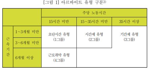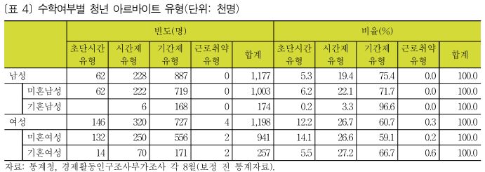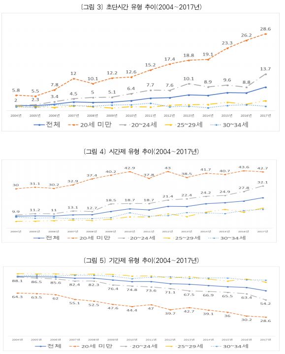 청년 아르바이트 노동자들 중 초단시간 유형과 시간제 유형은 지속해서 증가하고 있으며 기간제 유형은 지속해서 감소하고 있다. 이러한 경향은 연령별로 편차가 더욱 크다. 초단시간 유형의 경우 20세 미만 노동자들의 증가율이 매우 크다. 20세 미만은 2004년 5.8%에서 2017년 28.6%로 급격하게 상승하였고, 20∼24세는 2004년 2.0%에서 2017년 13.7%로 급격하게 상승하였다. 하지만 25세∼34세의 경우 초단시간 유형 일자리 증가는 보이지 않는다.