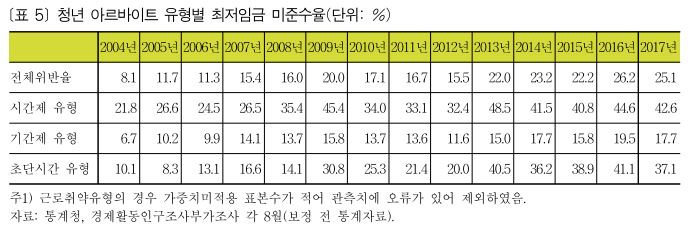 2017년 청년 아르바이트 노동자의 최저임금 미준수율은 25.1%이다. 경제활동인구 전체 임금노동자의 최저임금 미준수율이 13.4%(김유선, 2017)인 것을 고려하면 청년 노동자의 최저임금 미준수율은 매우 심각한 상태인 것을 알수 있다. 무엇보다 2017년 초단시간 유형 노동자 중 37.1%가 최저임금 미만으로 일을 하였으며, 시간제 유형 노동자 중 42.6%가 최저임금 미만으로 일을 하였다. 그리고 이러한 문제는 지역 청년들에게 더 크게 나타난다(김종진 외, 2017).