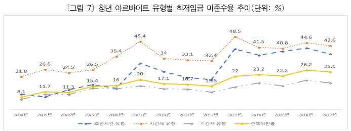 더욱 심각한 것은 2004년 청년 아르바이트 노동자들의 최저임금 미달자 비율이 8.1%였는데, 시간이 지날수록 최저임금 미달자가 점점 많아진다는데 있다. 이는 최저임금제도가 저임금계층 해소 및 노동권 보장이라는 기본적인 목적에 부합하지 못한다는 사실을 보여주고 있다.