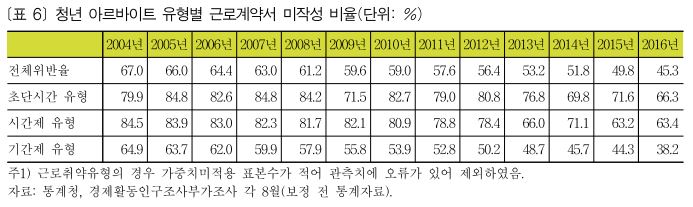 본 연구에서 분석한 결과 청년 아르바이트 노동자 중 45.3%가 근로계약서를 작성하지 않았다. 그리로 이러한 문제점은 초단시간 유형과 시간제 유형에 더 크게 나타났다. 초단시간 유형 노동자 중 66.3%, 시간제 유형 노동자 중 63.4%가 근로계약서를 작성하지 않은 것으로 나타났다.