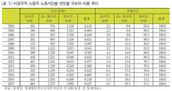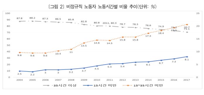 2004년 이후 비정규직 노동자 중 1주간 15시간 미만 일하는 노동자와 15∼35시간 일하는 노동자의 규모와 비율은 점차 증가하고 있다. 초단시간 일자리와 시간제 일자리의 증가는 비정규직 노동자들의 고용의 질과 노동환경의 향상에 큰 장애물이 될 수 있다. 무엇보다 이러한 임시적이고 단기적인 일자리의 증가는 산업적인 특성과 사업장규모 요인이 크다. 이러한 논의는 4장의 청년 비정규직의 수요 측면에서 살펴보겠다.