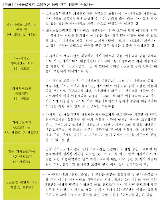 그 후 국회에는 ‘가사근로자 보호 등에 관한 법률안’(김춘진의원 대표발의, 2013.5.20.) ‘가사근로자의 고용개선 등에 관한 법률안’(이인영의원 대표발의, 2016.2.4.)이 발의되었으나 회기만료로 폐기된 바 있으며 지난 정부에서는 가사서비스 공식화를 위해 2015년에 ‘(가칭)가사서비스 이용 및 가사종사자 고용 촉진에 관한 특별법’ 제정 등 가사서비스 제도화를 추진하겠다고 발표한 바 있으나 법률 제정에는 이르지 못하였다. 현 정부의 출범과 함께 가사서비스 공식화가 국정과제에 포함되어 고용노동부는 ‘가사근로자 고용개선 등에 관한 법률안’을 입법예고(2017.6.20)한 후 국무회의 의결을 거처 국회에 제출(2017.12.28.)한 상태이다. 국회에 제출된 ‘가사근로자의 고용개선 등에 관한 법률안’은 “가사근로자를 고용하여 가사서비스를 제공하는 가사서비스 제공기관의 인증 및 운영에 관한 사항과 그 소속 가사근로자의 근로조건에 관한 사항을 규정함으로써 가사서비스와 관련하여 양질의 일자리를 창출하고 가사근로자의 고용안정과 근로조건 향상을 도모하는 것을 목적”으로 하고 있다. 구체적으로 가사서비스를 제공하는 근로자가 노동부가 인증한 가사서비스 제공기관에 고용될 경우 4대 보험을 비롯한 연차, 휴게시간, 퇴직금 등 근로자로서의 권리를 보장받을 수 있도록 하고 있다. 뿐만 아니라 가사서비스 제공기관인 법인에 소속된 근로자인 가사노동자는 사회적으로도 소속이 있는 직업인으로서 경력관리와 숙련도를 관리할 수 있어 직업인으로서의 자부심을 가질 수 있게 되었다.